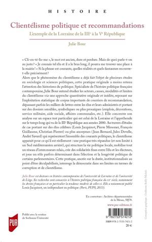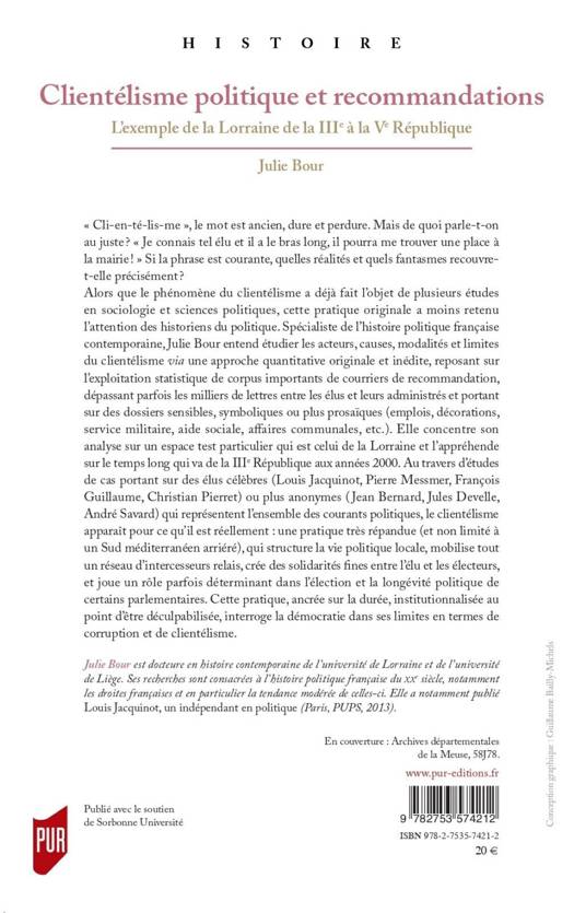Alors que le phénomène du clientélisme a déjà fait l’objet de plusieurs études en sociologie et sciences politiques, cette pratique originale a moins retenu l’attention des historiens du politique. Spécialiste de l’histoire politique française contemporaine, Julie Bour entend étudier les acteurs, causes, modalités et limites du clientélisme via une approche quantitative originale et inédite, reposant sur l’exploitation statistique de corpus importants de courriers de recommandation, dépassant parfois les milliers de lettres entre les élus et leurs administrés et portant sur des dossiers sensibles, symboliques ou plus prosaïques (emplois, décorations, service militaire, aide sociale, affaires communales, etc.). Elle concentre son analyse sur un espace test particulier qui est celui de la Lorraine et l’appréhende sur le temps long qui va de la IIIe République aux années 2000. Au travers d’études de cas portant sur des élus célèbres (Louis Jacquinot, Pierre Messmer, François Guillaume, Christian Pierret) ou plus anonymes (Jean Bernard, Jules Develle, André Savard) qui représentent l’ensemble des courants politiques, le clientélisme apparaît pour ce qu’il est réellement : une pratique très répandue (et non limité à un Sud méditerranéen arriéré), qui structure la vie politique locale, mobilise tout un réseau d’intercesseurs relais, crée des solidarités fines entre l’élu et les électeurs, et joue un rôle parfois déterminant dans l’élection et la longévité politique de certains parlementaires. Cette pratique, ancrée sur la durée, institutionnalisée au point d’être déculpabilisée, interroge la démocratie dans ses limites en termes de corruption et de clientélisme.