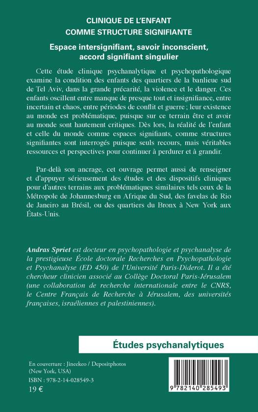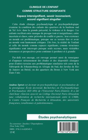 Cette étude clinique psychanalytique et psychopathologique examine la condition des enfants des quartiers de la banlieue sud de Tel Aviv, dans la grande précarité, la violence et le danger. Ces enfants oscillent entre manque de presque tout et insignifiance, entre incertain et chaos, entre périodes de conflit et guerre; leur existence au monde est problématique, puisque sur ce terrain être et avoir au monde sont hautement critiques. Dès lors, la réalité de l'enfant et celle du monde comme espaces signifiants, comme structures signifiantes sont interrogés puisque seuls recours, mais véritables ressources et perspectives pour continuer à perdurer et à grandir. Par-delà son ancrage, cet ouvrage permet aussi de renseigner et d'appuyer sérieusement des études et des dispositifs cliniques pour d'autres terrains aux problématiques similaires tels ceux de la Métropole de Johannesburg en Afrique du Sud, des favelas de Rio de Janeiro au Brésil, ou des quartiers du Bronx à New York aux États-Unis.