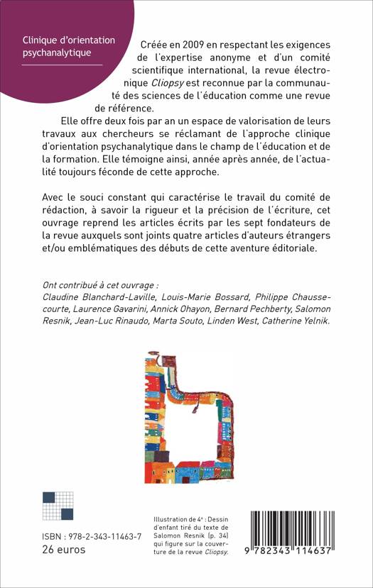Créée en 2009, la revue électronique Cliopsy est reconnue par la communauté des sciences de l'éducation comme une revue de référence. Elle offre deux fois par an un espace de travail aux chercheurs se réclamant de l'approche clinique d'orientation psychanalytique dans le champ de l'éducation et de la formation. Elle témoigne ainsi, année après année, de l'actualité toujours féconde de cette approche. Cet ouvrage reprend donc les articles écrits par les sept fondateurs de la revue, auxquels sont joints quatre articles d'auteurs étrangers.
