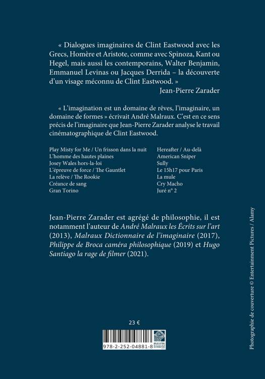 « L’imagination est un domaine de rêves, l’imaginaire, un domaine de formes » écrivait André Malraux. C’est en ce sens précis de l’imaginaire que Jean-Pierre Zarader analyse le travail cinématographique de Clint Eastwood.