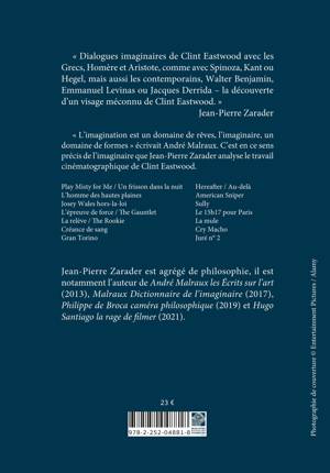 « Dialogues imaginaires de Clint Eastwood avec les Grecs, Homère et Aristote, comme avec Spinoza, Kant ou Hegel, mais aussi les contemporains, Walter Benjamin, Emmanuel Levinas ou Jacques Derrida – la découverte d’un visage méconnu de Clint Eastwood. » Jean-Pierre Zarader