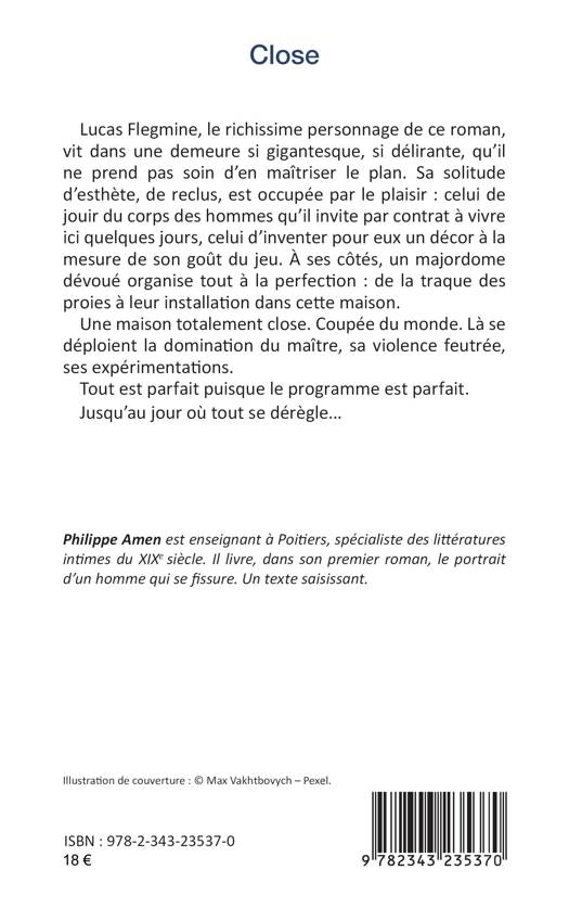 Lucas Flegmine, le richissime personnage de ce roman, vit dans une demeure si gigantesque, si délirante, qu'il ne prend pas soin d'en maîtriser le plan. Sa solitude d'esthète, de reclus, est occupée par le plaisir: celui de jouir du corps des hommes qu'il invite par contrat à vivre ici quelques jours, celui d'inventer pour eux un décor à la mesure de son goût du jeu. À ses côtés, un majordome dévoué organise tout à la perfection: de la traque des proies à leur installation dans cette maison. Une maison totalement close. Coupée du monde. Là se déploient la domination du maître, sa violence feutrée, ses expérimentations. Tout est parfait puisque le programme est parfait. Jusqu'au jour où tout se dérègle...