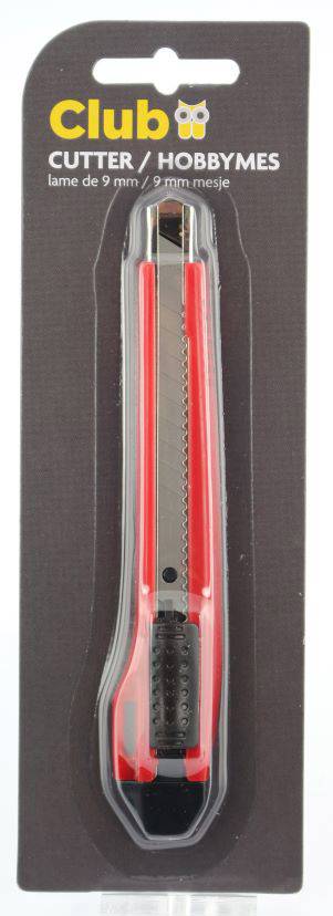 Cutter CLUB avec guide en métal, zone de préhension en plastique rouge, lame universelle de 9mm rétractable, casse-lame intégré, curseur autobloquant.