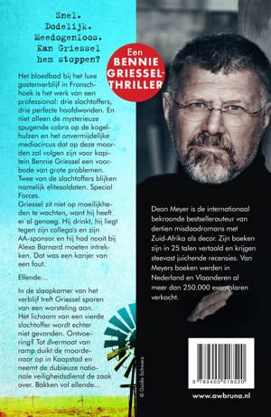 Het bloedbad bij het luxe gastenverblijf in Franschhoek is het werk van een professional: drie slachtoffers, drie perfecte hoofdwonden. En niet alleen de mysterieuze spugende cobra op de kogelhulzen en het onvermijdelijke mediacircus dat op deze moorden zal volgen zijn voor kapitein Bennie Griessel een voorbode van grote problemen. Twee van de slachtoffers blijken namelijk elitesoldaten. Special Forces.
