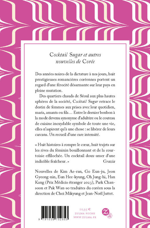 Des quartiers chauds de Séoul aux plus hautes sphères de la société, Cocktail Sugar retrace le destin de femmes aux prises avec leur quotidien, maris, amants ou fils… Entre le dernier bonbon à la mode devenu synonyme d’adultère ou le couteau de cuisine inoxydable symbole de toute une vie, elles n’aspirent qu’à une chose : se libérer de leurs carcans. Un recueil d’une rare intensité.