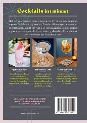 Met wat voorbereiding kan iedereen een te gek drankje mixen in ongeveer de tijd die nodig is om een fles wijn te kiezen, open te maken en uit te schenken. In dit boek vind je 60 verschillende cocktails, inclusief originele recepten en smakelijke variaties op klassiekers. En ze zijn stuk voor stuk binnen een minuut te maken.
