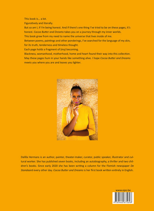 Cocoa Butter and Dreams. A Collection of Poems, Paintings and Ponderings on (my) Blackness is the first book in English by Belgian author, columnist and theatre-maker Dalilla Hermans. This layered art book combines nearly ten years of poems, letters and essays — some originally written for the stage, many never published before. Hermans wrote them all in English, the language she instinctively turned to when giving shape to Blackness within a European context. The collection also features twenty original paintings, created especially for this project. With tenderness and colour, Hermans explores the emotional and cultural weight of Black womanhood: the joy, the doubt, the memory and becoming. Cocoa Butter and Dreams offers a quiet but vibrant journey — one that speaks to anyone navigating identity, memory and belonging.