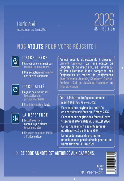 Expertise juridique incontournable des auteurs : Annoté sous la direction de Laurent Leveneur, professeur à l’université de Paris-Panthéon-Assas et directeur du laboratoire de droit civil, ce code est enrichi par de grands spécialistes.