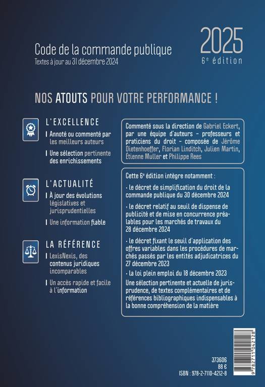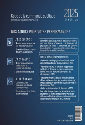Le Code de la commande publique commenté présente l'ensemble des règles applicables aux contrats de commande publique, marchés comme concessions. Il est enrichi de textes de droit interne et de jurisprudence. Il comprend une table de concordance (facilitant le rapprochement avec l'ancien Code des marchés publics). Cette 6e édition est commentée par de grands spécialistes de la matière sous la direction de Gabriel Eckert, Professeur à l'université de Strasbourg.