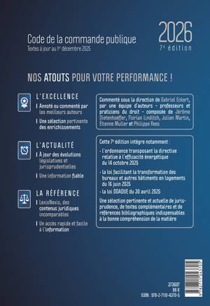 Le Code de la commande publique commenté présente l'ensemble des règles applicables aux contrats de commande publique, marchés comme concessions. Il est enrichi de textes de droit interne et de jurisprudence. Il comprend une table de concordance (facilitant le rapprochement avec l'ancien Code des marchés publics). Cette 7e édition est commentée par de grands spécialistes de la matière sous la direction de Gabriel Eckert, Professeur à l'université de Strasbourg.