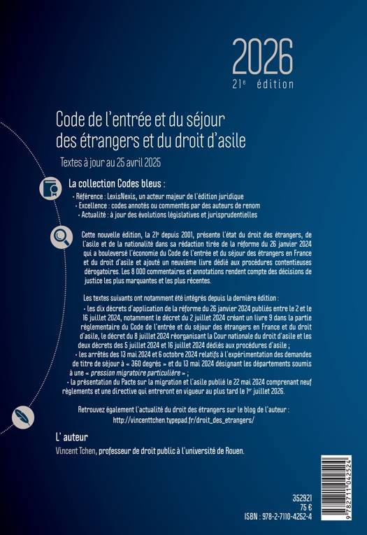 L'auteur est un spécialiste de la matière (voir le blog de l'auteur sur l'actualité du droit des étrangers : http ://vincenttchen.typepad.fr/droit_des_etrangers/) Livre Ier. - Dispositions générales Livre II. - Dispositions applicables aux citoyens de l'Union européenne et aux membres de leur famille Livre III. - Entrée en France Livre IV. - Séjour en France Livre V. - Droit d'asile et autres protections internationales Livre VI. - Décisions d'éloignement Livre VII. - Exécution des décisions d'éloignement Livre VIII. - Contrôle et sanctions Partie annexes : 1. Accès à la nationalité française ; 2. Dispositions non codifiées relatives au Code de l'entrée et du séjour des étrangers ; 3. Droits reconnus aux étrangers par la Convention européenne de sauvegarde des droits de l'Homme et des libertés fondamentales du 4 novembre 1950 ; 4. Conditions d'entrée et de séjour régies par un accord bilatéral ; 5. Droit de l'Union européenne régissant les conditions d'entrée et de séjour en France ; 6. Séjour des étrangers en France ; 7. Droit de l'asile et des apatrides.
