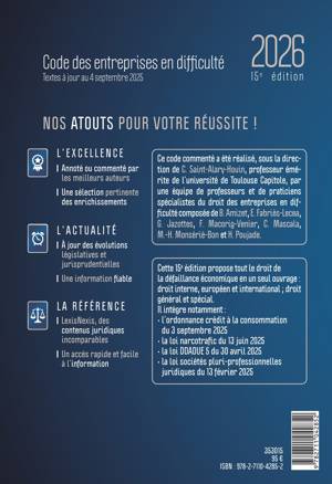Le Code des entreprises en difficulté est incontournable pour connaître les règles applicables à la prévention et au traitement des difficultés des entreprises. Ce code réunit l'ensemble des textes relatifs au droit des entreprises en difficulté : droit commun et droit spécial, droit antérieur toujours applicable à certaines procédures, surendettement et sûretés. Au-delà du droit français, il présente le droit de l'Union européenne et le droit international spécifique à la matière. Il est à jour des dernières réformes et propose une dizaine de formules. 1/ Ce code rassemble les règles nationales, européennes et internationales en matière de droit des entreprises en difficulté. 2/ Sous la direction de Corinne Saint-Alary-Houin, Professeur émérite à l'université Toulouse Capitole, des auteurs spécialistes rassemblent textes et jurisprudence indispensables à la compréhension de la matière. 3/ Pratique, ce code présente le droit commun, le droit spécial et le droit international. Y sont rassemblées également les règles relatives au surendettement, aux sûretés, à l'entrepreneur individuel et au droit de l'environnement. Il propose au praticien des formules.