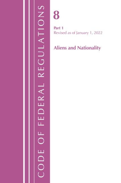 Title 8 presents regulations governing the process and procedures which impact immigration and naturalization. Additions and revisions to this section of the code are posted annually by January. Publication follows within six months. ,
