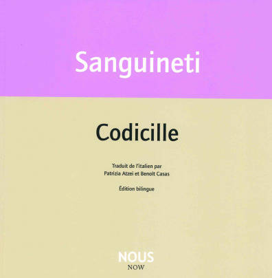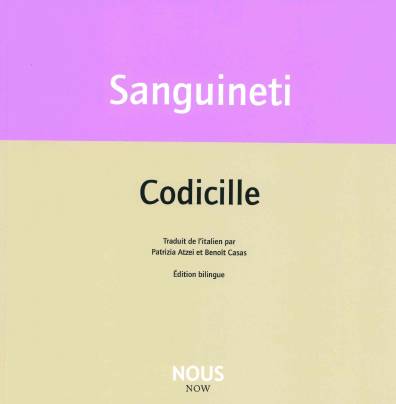 Les poèmes qui composent Codicille sont comme autant de cartes postales, dont l'agencement constitue une sorte de journal en poèmes : poèmes autobiographiques de la quotidienneté, du voyage, et de l'adresse à la compagne et destinatrice de toujours, Luciana. Codicille expose en particulier le théâtre du couple et sa vie amoureuse, faite de tendresse et de ratages. La langue de Sanguineti - inépuisable mélange de vocabulaire savant, de jeux sonores multiples et du langage le plus trivial - y est toujours vive, inventive et jouissive.