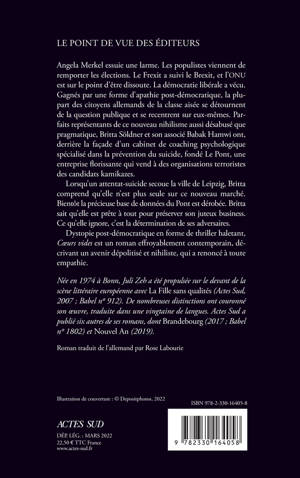 Angela Merkel essuie une larme. Les populistes viennent de remporter les élections. Le Frexit a suivi le Brexit, et l'ONU est sur le point d'être dissoute. La démocratie libérale a vécu. Gagnés par une forme d'apathie post-démocratique, la plupart des citoyens allemands de la classe aisée se détournent de la question publique et se recentrent sur eux-mêmes. Parfaits représentants de ce nouveau nihilisme aussi désabusé que pragmatique, Britta Söldner et son associé Babak Hamwi ont, derrière la façade d'un cabinet de coaching psychologique spécialisé dans la prévention du suicide, fondé Le Pont, une entreprise florissante qui vend à des organisations terroristes des candidats kamikazes. Lorsqu'un attentat-suicide secoue la ville de Leipzig, Britta comprend qu'elle n'est plus seule sur ce nouveau marché. Bientôt la précieuse base de données du Pont est dérobée. Britta sait qu'elle est prête à tout pour préserver son juteux business. Ce qu'elle ignore, c'est la détermination de ses adversaires. Dystopie post-démocratique en forme de thriller haletant, "Coeurs vides" est un roman effroyablement contemporain, décrivant un avenir dépolitisé et nihiliste, qui a renoncé à toute empathie.