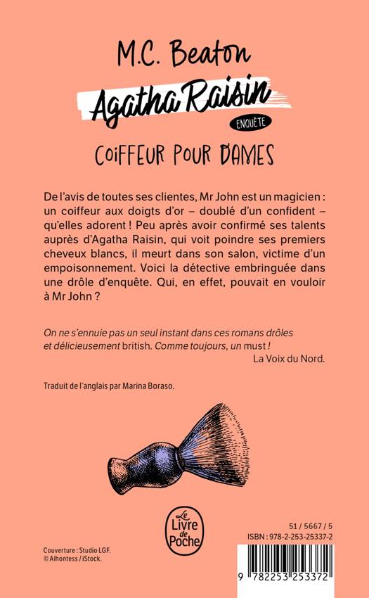 De l’avis de toutes ses clientes, Mr John est un magicien : un coiffeur aux doigts d’or – doublé d’un confident – qu’elles adorent ! Peu après avoir confirmé ses talents auprès d’Agatha Raisin, qui voit poindre ses premiers cheveux blancs, il meurt dans son salon, victime d’un empoisonnement. Voici la détective embringuée dans une drôle d’enquête. Qui, en effet, pouvait en vouloir à Mr John ?