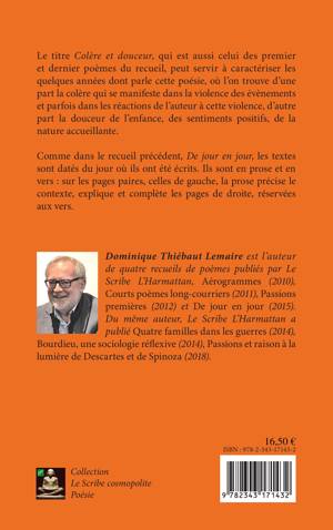 Le titre Colère et douceur, qui est aussi celui des premier et dernier poèmes du recueil, peut servir à caractériser les quelques années dont parle cette poésie, où l'on trouve d'une part la colère qui se manifeste dans la violence des évènements et parfois dans les réactions de l'auteur à cette violence, d'autre part la douceur de l'enfance, des sentiments positifs, de la nature accueillante. Comme dans le recueil précédent, De jour en jour, les textes sont datés du jour où ils ont été écrits. Ils sont en prose et en vers : sur les pages paires, celles de gauche, la prose précise le contexte, explique et complète les pages de droite, réservées aux vers.