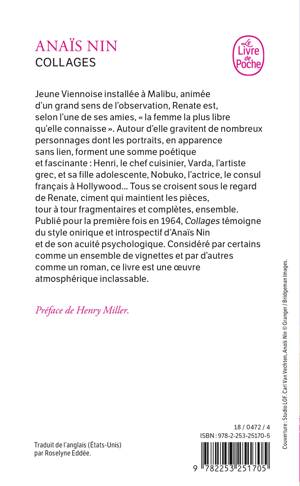 Jeune Viennoise installée à Malibu, animée d’un grand sens de l’observation, Renate est, selon l’une de ses amies, « la femme la plus libre qu’elle connaisse ». Autour d’elle gravitent de nombreux personnages, dont les portraits, en apparence sans liens entre eux, forment une somme poétique et fascinante : Henri, le chef cuisinier ; Varda, l’artiste grec et sa fille adolescente ; Nobuko, l’actrice ; le consul français à Hollywood... Tous se croisent sous le regard de Renate, ciment qui maintient les pièces, tour à tour fragmentaires et complètes, ensemble. Publié pour la première fois en 1964, Collages témoigne du style onirique et introspectif d’Anaïs Nin et de son acuité psychologique. Considéré par certains comme un ensemble de vignettes et par d’autres comme un roman, ce livre est une œuvre atmosphérique inclassable.