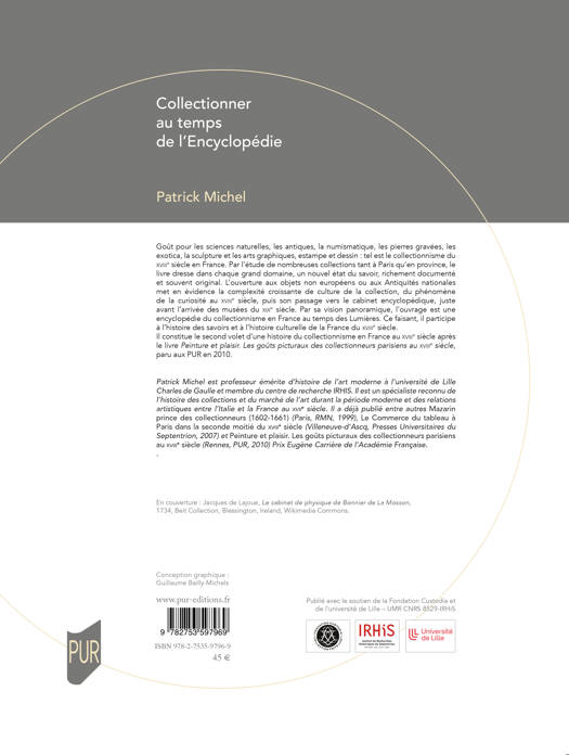 Goût pour les sciences naturelles, les antiques, la numismatique, les pierres gravées, les exotica, la sculpture et les arts graphiques, estampe et dessin : tel est le collectionnisme du XVIIIe siècle en France. Par l’étude de nombreuses collections tant à Paris qu’en province, le livre dresse dans chaque grand domaine, un nouvel état du savoir, richement documenté et souvent original. L’ouverture aux objets non européens ou aux Antiquités nationales met en évidence la complexité croissante de culture de la collection, du phénomène de la curiosité au XVIIIe siècle, puis son passage vers le cabinet encyclopédique, juste avant l’arrivée des musées du XIXe siècle. Par sa vision panoramique, l’ouvrage est une encyclopédie du collectionnisme en France au temps des Lumières. Ce faisant, il participe à l’histoire des savoirs et à l’histoire culturelle de la France du XVIIIe siècle. Il constitue le second volet d’une histoire du collectionnisme en France au XVIIIe siècle après le livre Peinture et plaisir. Les goûts picturaux des collectionneurs parisiens au XVIIIe siècle, paru aux PUR en 2010.