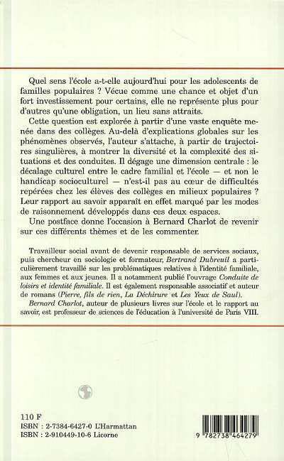 Quel sens l'école a-t-elle aujourd'hui pour les adolescents de familles populaires ? Vécue comme une chance et objet d'un fort investissement pour certains, elle ne représente plus pour d'autres qu'une obligation, un lieu sans attraits. Cette question est explorée à partir d'une vaste enquête menée dans des collèges. L'auteur s'attache, à partir de trajectoires singulières, à montrer et la complexité des situations et des conduites.