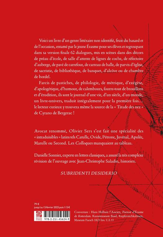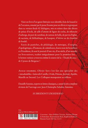 Avocat renommé, Olivier Sers s’est fait une spécialité des « intraduisibles » latins tels Catulle, Ovide, Pétrone, Juvénal, Apulée, Marulle ou Second. Les Colloques manquaient au tableau.