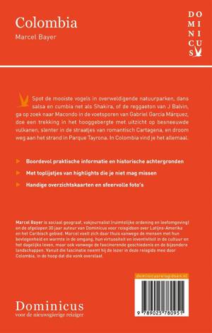 Ontdek Colombia op vakantie met deze Dominicus-reisgids en verken de poort van Zuid-Amerika. Het landschap van Colombia wordt grotendeels gevormd door de uitlopers van de indrukwekkende Andes. Die zorgen voor spectaculaire variatie met smaragdgroene valleien, ruig hoogland, kurkdroge woestijn en tropisch regenwoud. Overal in het land zijn de sporen van een rijk verleden zichtbaar: van de koloniale stedelijke parels Cartagena en Popayán tot de archeologische parken bij San Agustín en Tierradentro. Geniet samen met de Colombianen van de kleurrijke cultuur in al haar vormen. Leef je uit op de opzwepende muziek van Shakira, stap in de literaire wereld van Gabriel García Márquez en bewonder de voluptueze vormen van de beelden van Fernando Botero. Deze reisgids staat boordevol praktische informatie, historische achtergronden, handige overzichtskaarten, sfeervolle foto's en uitgebreide culturele achtergrondinformatie. Bovendien zijn Dominicus-reisgidsen altijd up-to-date en geschreven door Nederlandstalige experts.