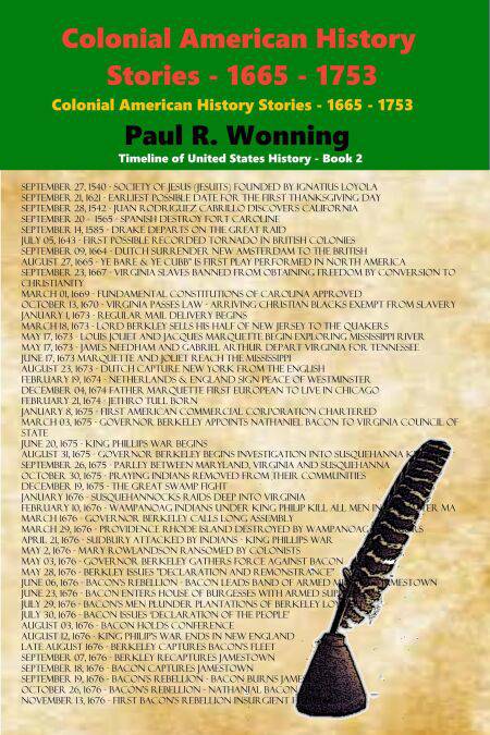 Colonial American History Stories - 1215 - 1664 contains almost 300 history stories presented in a timeline that begins in 1655 with the performance of the first documented play performed in British North America and ends with the switch from the Julian to the Gregorian Calendar in 1752. This journal of historical events mark the beginnings of the United States and serve as a wonderful guide of American history. These reader friendly stories include: