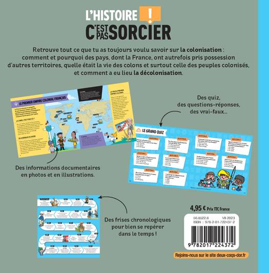 Une première approche ludique et interactive de l’Histoire, pour tout savoir sur la colonisation : comment et pourquoi des pays, dont la France, ont autrefois pris possession d’autres territoires, quelle était la vie des colons et surtout celle des peuples colonisés, et comment a eu lieu la décolonisation. Avec des informations documentaires en photos et en illustrations, des anecdotes, des quiz et des jeux disséminés au fil des pages, pour apprendre en s’amusant (« vrai ou faux », « trouve l’intrus », « incroyable mais vrai »…). Et des frises chronologiques pour bien se repérer dans le temps !