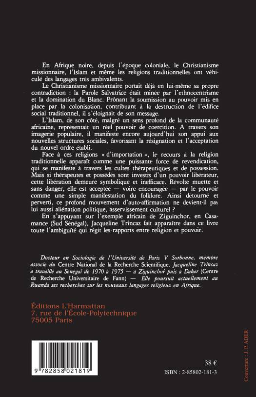 Depuis l'époque coloniale, l'Afrique noire subit l'influence de multiples religions aux langages ambivalents. Face au Christianisme, prônant la soumission au colon Blanc, et à l'Islam, qui favorise la résignation et l'acceptation du nouvel ordre établi, le recours à la religion traditionnelle apparaît comme une puissante force de revendication. En s'appuyant sur l'exemple de Ziguinchor, en Casamance (Sud Sénégal), Jacqueline Trincaz fait ressortir toute l'ambiguïté régissant les rapports entre religion et pouvoir.