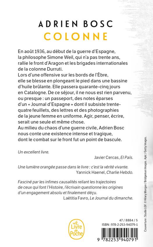 En août 1936, au début de la guerre d’Espagne, la philosophe Simone Weil, qui n’a pas trente ans, rallie un groupe international de la colonne Durruti. Lors d’une offensive sur les bords de l’Èbre, elle se blesse en plongeant le pied dans une bassine d’huile brûlante. Elle passe quarante-cinq jours en Espagne. De ce séjour, nous ne savons rien ou presque. Un passeport, des notes éparses d’un « Journal d’Espagne » dont il subsiste trente-quatre feuillets, des lettres et des photographies en uniforme. Agir, penser, écrire, serait une seule et même chose. Au milieu du chaos d’une guerre civile, Adrien Bosc nous conte une existence intense et tragique, dont le combat en Espagne fut un point de bascule.