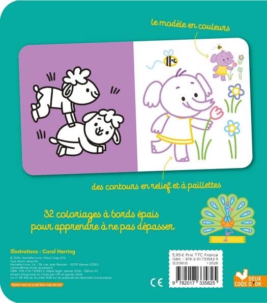 Retrouve 32 coloriages à bords épais pour apprendre à ne pas dépasser : certains avec des bords en relief et pailletés ! Des animaux réels ou imaginaires : chiot, chaton, ourson, éléphant, lion, dinosaure, licorne, canard, vache...