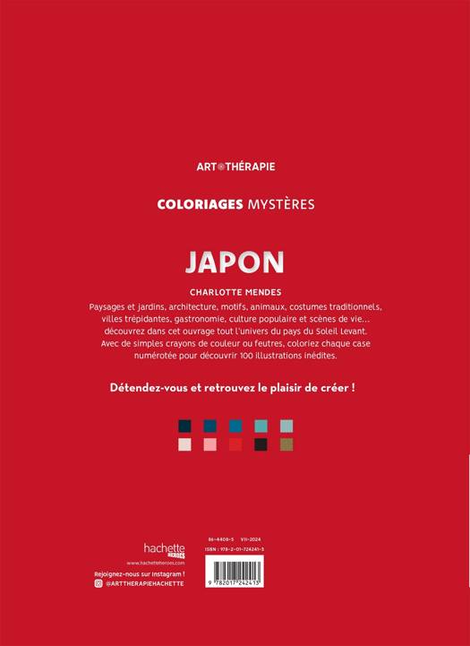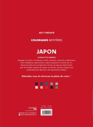 Paysages et jardins, architecture, motifs, animaux, costumes traditionnels, villes trépidantes, gastronomie, culture populaire et scènes de vie… découvrez dans cet ouvrage tout l’univers du pays du Soleil Levant. Avec de simples crayons de couleur ou feutres, coloriez chaque case numérotée pour découvrir 100 illustrations inédites. Détendez-vous et retrouvez le plaisir de créer !