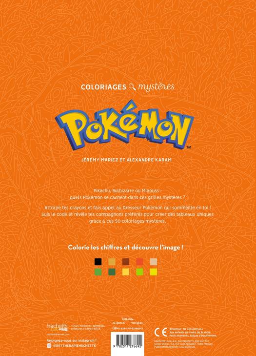 Pokémon , attrape les tous ... en couleurs ! Pikachu, Bulbizarre ou Miaouss : quels Pokémon se cachent dans ces grilles mystères ? Attrape tes crayons et réveille le dresseur qui sommeille en toi ! Suis le code couleur et révèle tes compagnons préférés à travers 50 coloriages mystères à compléter...