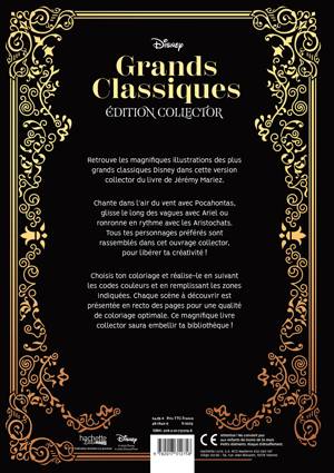 Retrouve les magnifiques illustrations des plus grands classiques Disney dans cette version collector du livre de Jérémy Mariez. Chante dans l'air du vent avec Pocahontas, glisse le long des vagues avec Ariel ou ronronne en rythme avec les Aristochats. Tous tes personnages préférés sont rassemblés dans cet ouvrage collector, pour libérer ta créativité ! Choisis ton coloriage et réalise-le en suivant les codes couleurs et en remplissant les zones indiquées. Chaque scène à découvrir est présentée en recto des pages pour une qualité de coloriage optimale. Ce magnifique livre collector saura embellir ta bibliothèque !