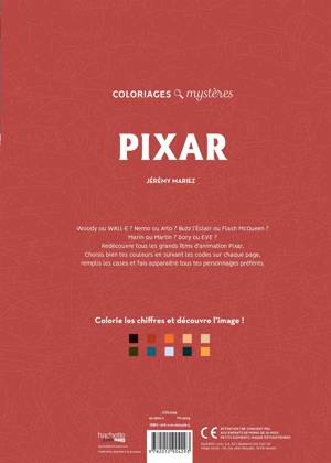 Redécouvre les scènes mythiques des chefs-d'oeuvre Pixar ! Grâce aux codes couleurs, applique chaque nuance dans la zone correspondante et révèle la scène représentée.