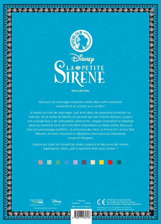 À travers ce livre de coloriages, suis Ariel dans ses aventures terrestres ou marines. De sa quête de liberté, en passant par son histoire d’amour, jusqu’à son courage face à de redoutables adversaires, chaque illustration te replonge dans les moments forts des trois films d’animation La Petite Sirène. Retrouve tous tes personnages préférés : la princesse des mers, le Prince Éric et leur fille Mélodie, les amis Polochon et Sébastien, mais aussi les méchantes Ursula et Morgana.