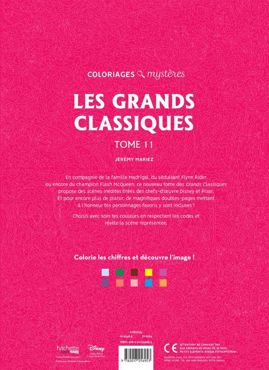 En compagnie de la famille Madrigal, du séduisant Flynn Rider ou encore du champion Flash McQueen, ce nouveau tome des Grands Classiques t'offre des scènes inédites tirées des chefs-d’oeuvre Disney et Pixar. Et pour maximiser le plaisir, de magnifiques doubles-pages mettant à l’honneur tes personnages favoris y sont incluses ! Grâce aux codes couleurs, applique chaque nuance dans la zone correspondante et révèle la scène représentée. Colorie les chiffres et découvre l'image !
