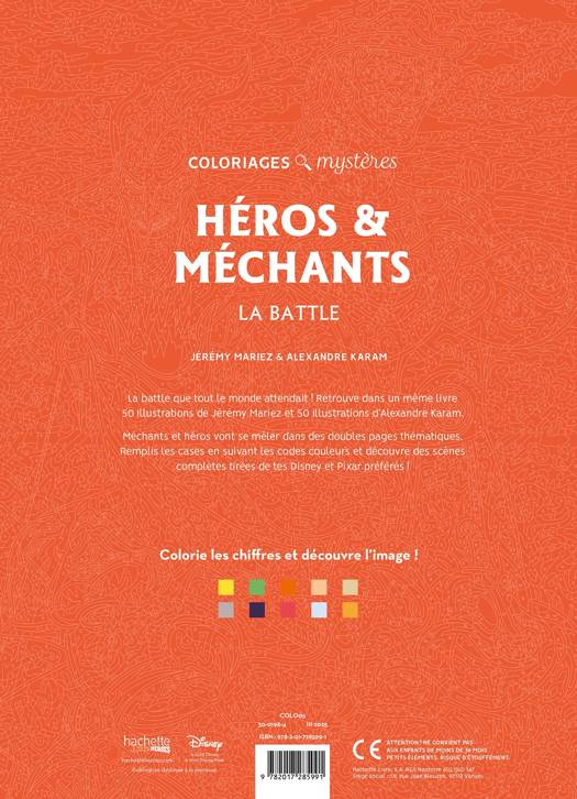 1 - CHOISIS TES OUTILS - crayons de couleur, feutres à eau ou feutres acryliques 2 - COLORIE LES NUMÉROS selon le code couleur pour révéler une magnifique illustration Disney ! 3 - PROFITE d'un moment de détente avec les livres de coloriage Hachette Heroes !