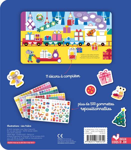 Des décors à colorier et compléter avec plus de 500 gommettes repositionnables : des gommettes géométriques unies ou à motifs (ronds, carrés, rectangles, triangles, étoiles...) et des gommettes silhouettées.