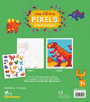 Un cahier de 32 pages proposant 25 coloriages pixels à colorier et à compléter avec 4 planches de stickers .3 planches de stickers pixels de toutes les couleurs, soit plus de 2000 pixels autocollants + 1 planche d'environ 20 stickers représentant des animaux. 4 principes de coloriages : des colos guidés avec petits carrés de couleur ; des dessins à compléter par symétrie horizontale ou verticale ; de grandes scènes illustrées à compléter avec les stickers d'animaux ; 8 coloriages à codes » (1 chiffre = 1 couleur). Les dessins en couleurs sont présentés en fin de cahier. Thématique : les dinosaures et animaux ayant vécu à la même époque.
