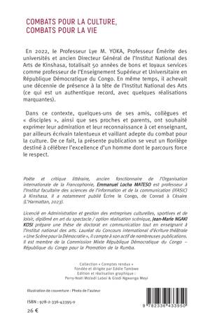 En 2022, le Professeur Lye M. YOKA, Professeur Émérite des universités et ancien Directeur Général de l'Institut National des Arts de Kinshasa, totalisait 50 années de bons et loyaux services comme professeur de l'Enseignement Supérieur et Universitaire en République Démocratique du Congo. En même temps, il achevait une décennie de présence à la tête de l'Institut National des Arts (ce qui est un authentique record, avec quelques réalisations marquantes). Dans ce contexte, quelques-uns de ses amis, collègues et disciples, ainsi que ses proches et parents, ont souhaité exprimer leur admiration et leur reconnaissance à cet enseignant, par ailleurs écrivain talentueux et vaillant adepte du combat pour la culture. De ce fait, la présente publication se veut un florilège destiné à célébrer l'excellence d'un homme dont le parcours force le respect.