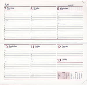 Artikelcode: KA26860 Specificaties: Harde kaft Gebonden 128 pagina's 1 week per 2 pagina's Beknopt maandoverzicht op elke pagina Uurindeling van 08.00 tot 20.00 uur Voorzien van perforatiehoek en leeslint Ruimte voor notities Formaat: 8 x 16,5 cm Gewicht: 86 gr