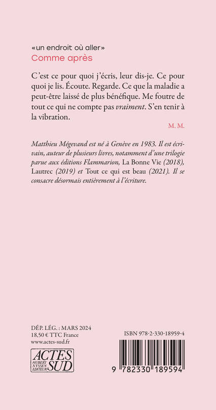 C'est ce pour quoi j'écris, leur dis-je. Ce pour quoi je lis. Écoute. Regarde. Ce que la maladie a peut-être laissé de plus bénéfique. Me foutre de tout ce qui ne compte pas "vraiment". S'en tenir à la vibration.