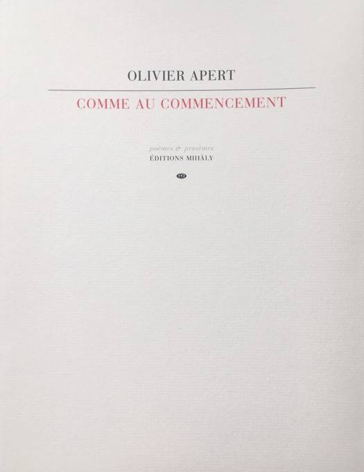Avec ce recueil composé de poèmes et de prosèmes hantés par la violence, la guerre et l'obsédante "tristesse initiale", sublimés par une tonalité inouïe et une réinvention du lyrisme, Olivier Apert ajoute à son oeuvre quasiment arrachée à la nuit, un livre où la figure féminine ("noli eam tangere") joue son double jeu de promesse et de tromperie.