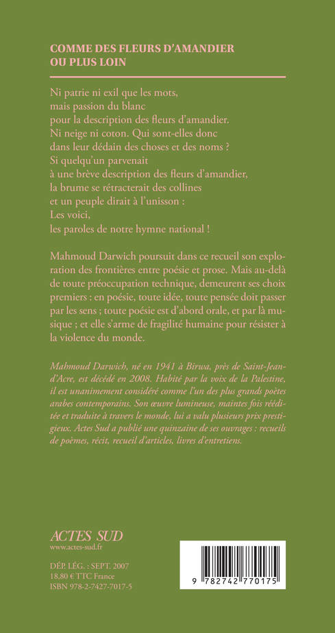 Le dernier recueil du poète palestinien est composé, pour l'essentiel, de pièces courtes qui célèbrent sous une forme immédiatement accessible et pourtant savante les choses simples de la vie.