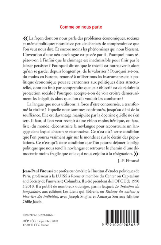 Ce n'est qu'à cette condition que l'on pourra déjouer le piège politique que nous tend la novlangue et retrouver le chemin d'une démocratie moins fragile que celle qui nous enjoint à la résignation. » J.-P. Fitoussi