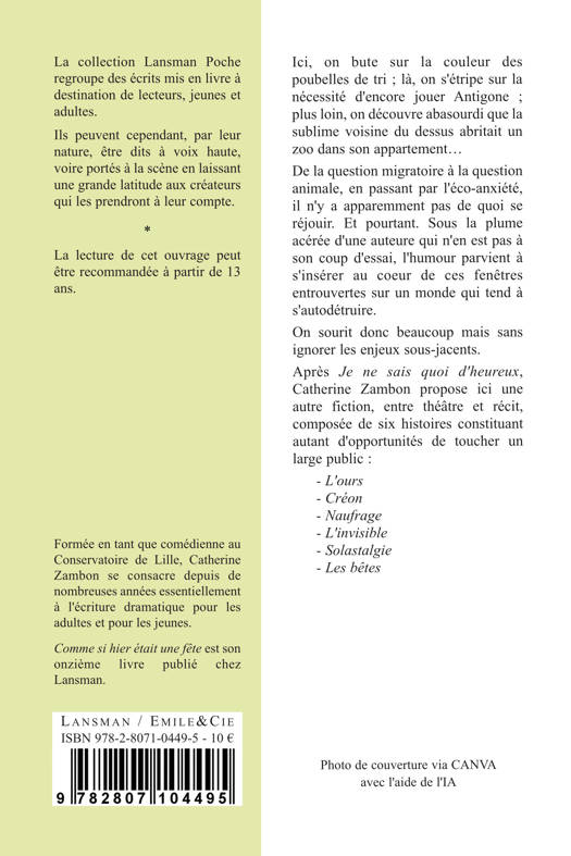 Ici, on bute sur la couleur des poubelles de tri ; là, on s'étripe sur la nécessité d'encore jouer Antigone ; plus loin, on découvre abasourdi que la sublime voisine du dessus abritait un zoo dans son appartement… De la question migratoire à la question animale, en passant par l'éco-anxiété, il n'y a apparemment pas de quoi se réjouir. Et pourtant. Sous la plume acérée d'une auteure qui n'en est pas à son coup d'essai, l'humour parvient à s'insérer au cœur de ces fenêtres entrouvertes sur un monde qui tend à s'autodétruire. On sourit donc beaucoup mais sans ignorer les enjeux sous-jacents. Après Je ne sais quoi d'heureux, Catherine Zambon propose ici une autre fiction, entre théâtre et récit, composée de six histoires constituant autant d'opportunités de toucher un large public : - L'ours - Créon - Naufrage - L'invisible - Solastalgie - Les bêtes
