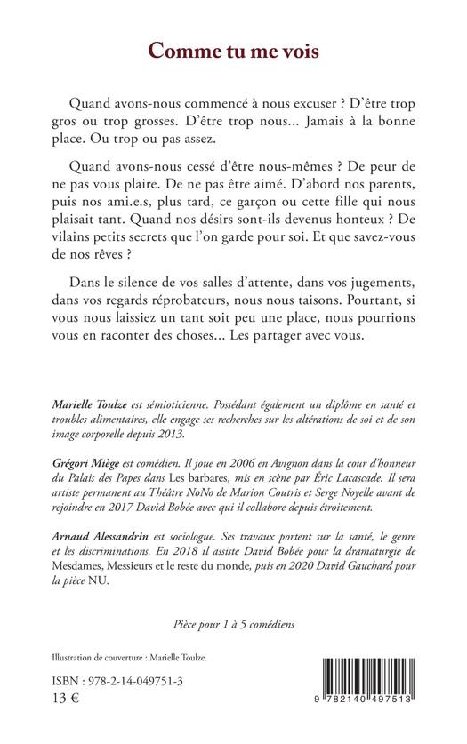 Quand avons-nous commencé à nous excuser ? D'être trop gros ou trop grosses. D'être trop nous... Jamais à la bonne place. Ou trop ou pas assez. Quand avons-nous cessé d'être nous-mêmes ? De peur de ne pas vous plaire. De ne pas être aimé. D'abord nos parents, puis nos ami.e.s, plus tard, ce garçon ou cette fille qui nous plaisait tant. Quand nos désirs sont-ils devenus honteux ? De vilains petits secrets que l'on garde pour soi. Et que savez-vous de nos rêves ? Dans le silence de vos salles d'attente, dans vos jugements, dans vos regards réprobateurs, nous nous taisons. Pourtant, si vous nous laissiez un tant soit peu une place, nous pourrions vous en raconter des choses... Les partager avec vous. Pièce pour 1 à 5 comédiens