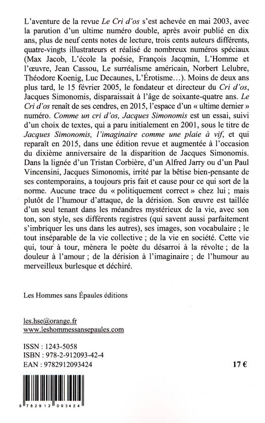 L’aventure de la revue « Le Cri d’os » s’est achevée en mai 2003, avec la parution d’un ultime numéro double, après avoir publié en dix ans, plus de neuf cents notes de lecture, trois cents auteurs différents, quatre-vingts illustrateurs et réalisé de nombreux numéros spéciaux (Max Jacob, L’école la poésie, François Jacqmin, L’Homme et l’œuvre, Jean Cassou, Le surréalisme américain, Norbert Lelubre, Théodore Koenig, Luc Decaunes, L’Érotisme…). Moins de deux ans plus tard, le 15 février 2005, le fondateur et directeur du « Cri d’os », Jacques Simonomis, disparaissait à l’âge de soixante-quatre ans. « Le Cri d’os » renaît de ses cendres, en 2015, l’espace d’un « ultime dernier » numéro. « Comme un cri d’os, Jacques Simonomis » est un essai, suivi d’un choix de textes, qui a paru initialement en 2001, sous le titre de « Jacques Simonomis, l’imaginaire comme une plaie à vif », et qui reparaît en 2015, dans une édition revue et augmentée à l’occasion du dixième anniversaire de la disparition de Jacques Simonomis. Dans la lignée d’un Tristan Corbière, d’un Alfred Jarry ou d’un Paul Vincensini, Jacques Simonomis, irrité par la bêtise bien-pensante de ses contemporains, a toujours pris fait et cause pour ce qui sort de la norme. Aucune trace du « politiquement correct » chez lui ; mais plutôt de l’humour d’attaque, de la dérision. Son œuvre est taillée d’un seul tenant dans les méandres mystérieux de la vie, avec son ton, son style, ses différents registres (qui savent aussi parfaitement s’imbriquer les uns dans les autres), ses images, son vocabulaire ; le tout inséparable de la vie collective ; de la vie en société. Cette vie qui, tour à tour, mènera le poète du désarroi à la révolte ; de la douleur à l’amour ; de la dérision à l’imaginaire ; de l’humour au merveilleux burlesque et déchiré.