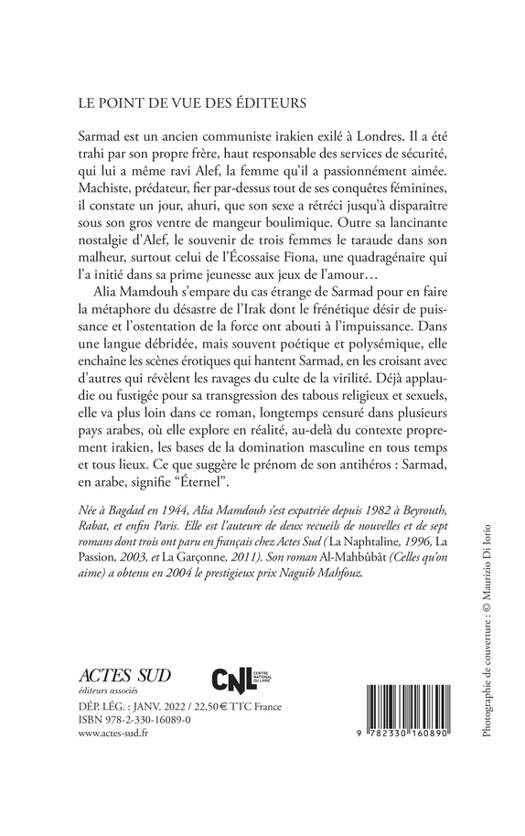 Sarmad est un ancien communiste irakien exilé à Londres. Il a été trahi par son propre frère, haut responsable des services de sécurité, qui lui a même ravi Alef, la femme qu'il a passionnément aimée. Machiste, prédateur, fier par-dessus tout de ses conquêtes féminines, il constate un jour, ahuri, que son sexe a rétréci jusqu'à disparaître sous son gros ventre de mangeur boulimique. Outre sa lancinante nostalgie d'Alef, le souvenir de trois femmes le taraude dans son malheur, surtout celui de l'Écossaise Fiona, une quadragénaire qui l'a initié dans sa prime jeunesse aux jeux de l'amour... Alia Mamdouh s'empare du cas étrange de Sarmad pour en faire la métaphore du désastre de l'Irak dont le frénétique désir de puissance et l'ostentation de la force ont abouti à l'impuissance. Dans une langue débridée, mais souvent poétique et polysémique, elle enchaîne les scènes érotiques qui hantent Sarmad, en les croisant avec d'autres qui révèlent les ravages du culte de la virilité. Déjà applaudie ou fustigée pour sa transgression des tabous religieux et sexuels, elle va plus loin dans ce roman, longtemps censuré dans plusieurs pays arabes, où elle explore en réalité, au-delà du contexte proprement irakien, les bases de la domination masculine en tous temps et tous lieux. Ce que suggère le prénom de son antihéros : Sarmad, en arabe, signifie "Éternel".